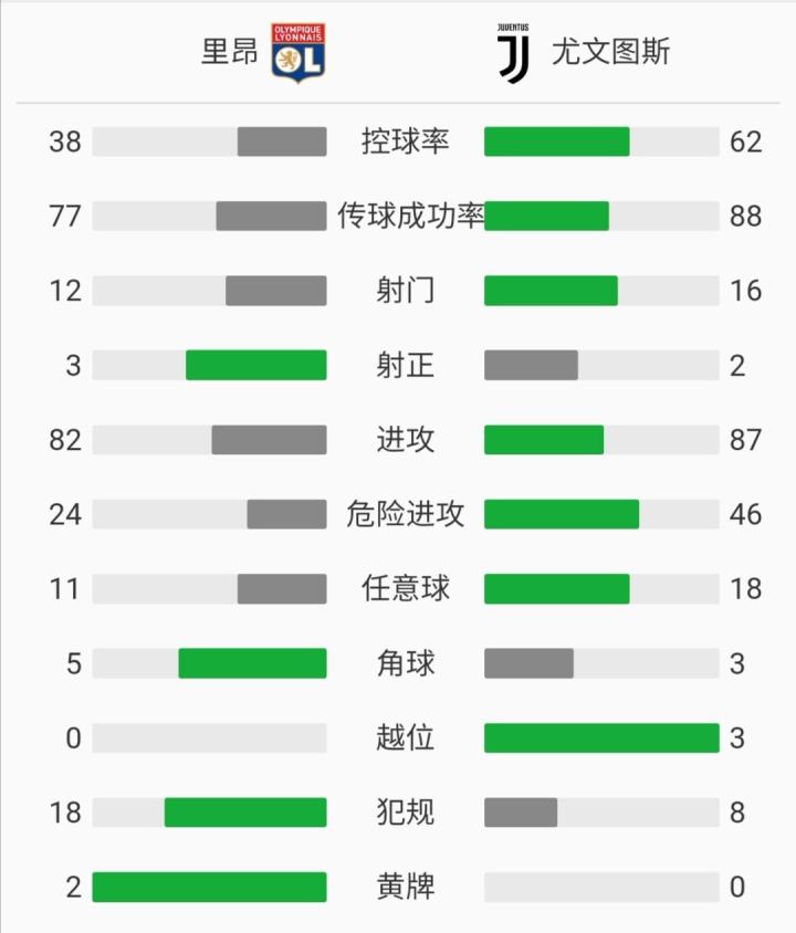 全场比赛结束,尤文图斯客场0-1不敌里昂。