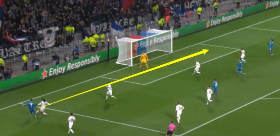 这是C罗在比赛第23分钟时的左路传中,他从左路中场附近便开始加速突破,到底线附近传出弧线球,然而这么长的时间里,尤文球员们在里昂禁区内竟然没有布置好争抢的点,队友后插上顶头球,自然是被对手门将轻松化解: