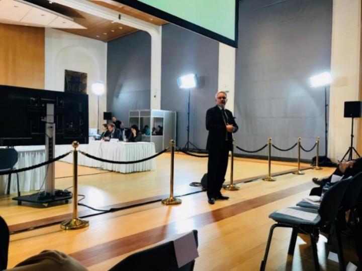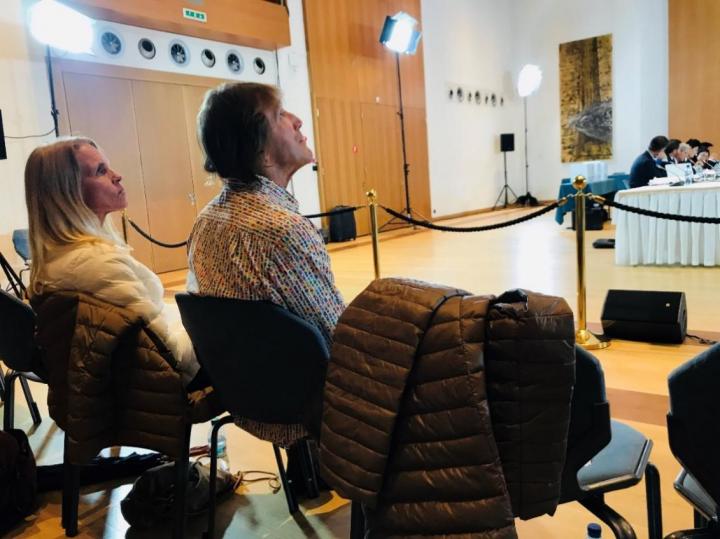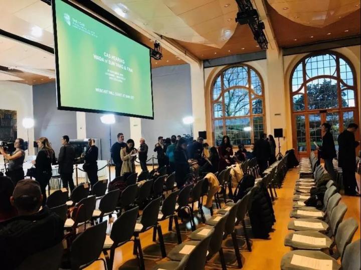 2019年11月15日早上8时,天刚蒙蒙亮,位于蒙特勒宫对面附楼的听审室已经开放;公众、媒体陆续抵达,其中不少来自国内。听众中最引人关注的,是孙杨多年的恩师丹尼斯教练。他与家人专程从澳大利亚飞抵瑞士,全程聚精会神关注听证。8时35分左右,仲裁庭及双方入场,并专门留出时间给媒体拍照、录影。孙杨注意到第一排就座的丹尼斯教练,特意走过来与他击拳,互相鼓励。9时,CAS播放了为此次听证专门制作的介绍短片,听证程序正式拉开序幕。