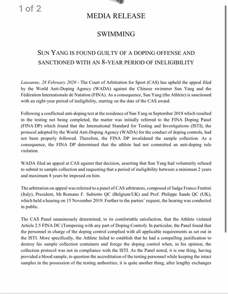 结果公布后,中国泳协回应称,“对国际体育仲裁法庭(CAS)就世界反兴奋剂机构(WADA)上诉国际泳联反兴奋剂小组和孙杨一案做出的裁决,我们深表遗憾。我们支持孙杨继续以法律手段维护自己的合法权益。同时希望世界反兴奋剂机构、体育组织、兴奋剂检查代理机构改进、完善规则,严格执行规则包括兴奋剂检查人员资证要求,不能忽视运动员个人合法权利,不能让任何人都可以去从事与运动员切身利益密切相关的兴奋剂检查工作。”