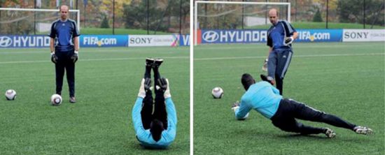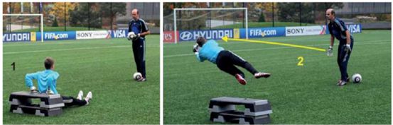 – 蹦床+跳跃+倒地+落在垫子上。 这项训练同时提高协调性(时空定位)以及守门员的体操能力。