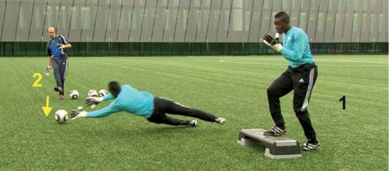 2. 倒地扑救(地滚球)。 换守门员。每侧3次