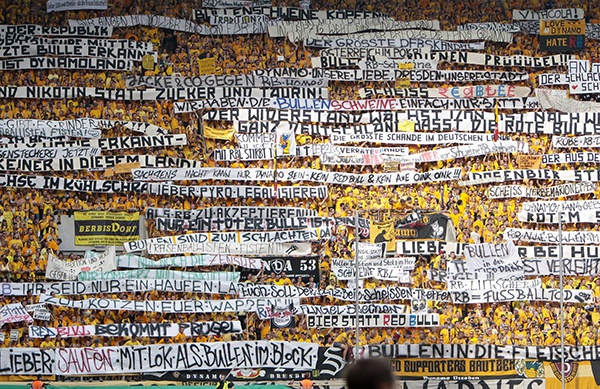 对于红牛集团强力注资,并且使用“改名草地球莱比锡”、“17个会员全部来自红牛董事会”等手段绕过50+1的RB莱比锡,多家德甲球队都打出了半抵制半辱骂的标语海洋。此外,还有往球场内扔牛头、打砸RB莱比锡大巴、拒绝在与莱比锡的比赛里助威甚至主动选择部分空场等各式各样的过激举动。