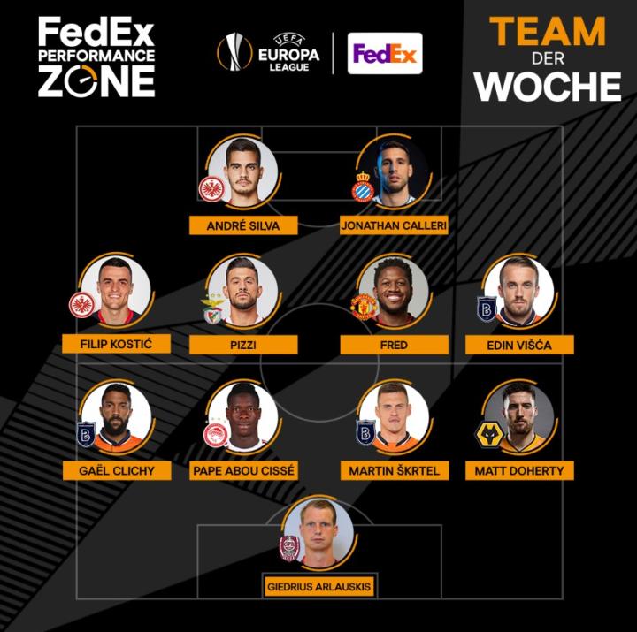 中场:菲利普-科斯蒂奇(法兰克福)、皮齐(本菲卡)、弗雷德(曼联)、维斯卡(伊斯坦布尔)