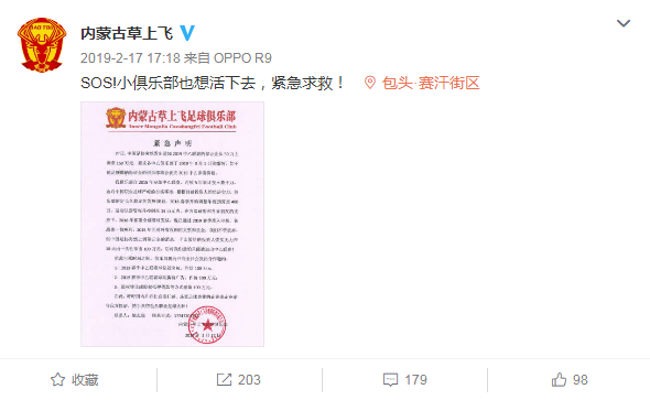 去年,2019赛季中乙联赛开始前,一家俱乐部的公告引起了一定的关注,内蒙古草上飞宣布将以众筹的方式向全社会募集100万元,用来支付新赛季的联赛保证金。