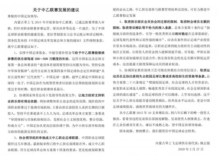 关于这份建议书,以及中乙联赛的相关情况,我们与内蒙古草上飞的投资人姚志强进行了聊天,为了更好的让大家阅读并理解,这次对话以问答实录的方式呈现。