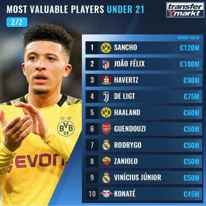 U21球员身价排行榜:桑乔1.2亿欧居首,前十德甲占四席