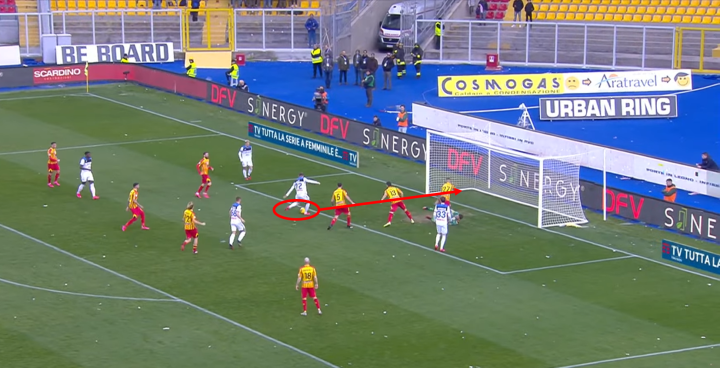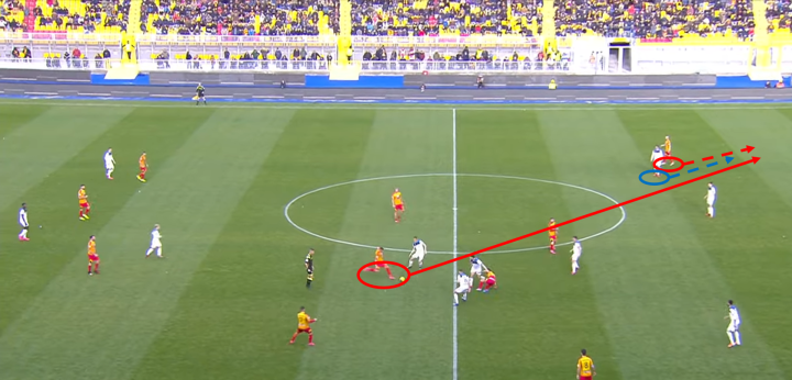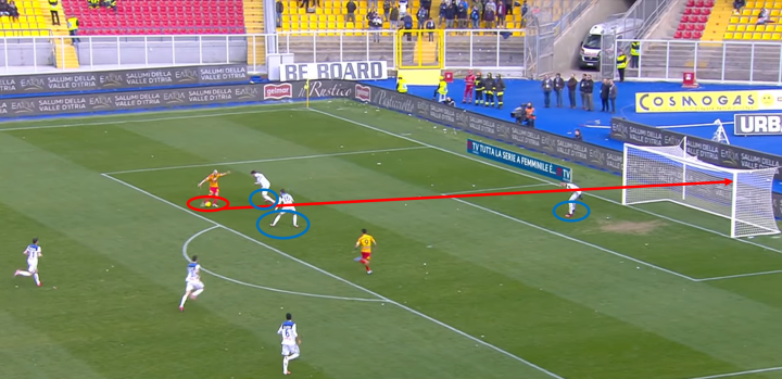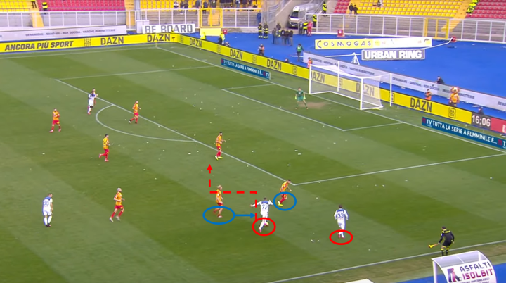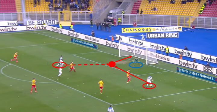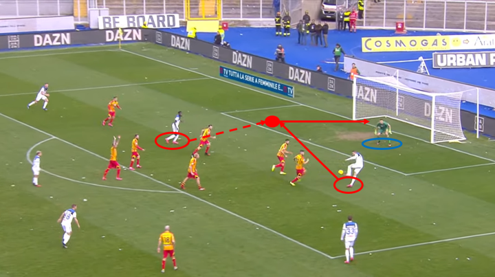 从下图可以看出,伊利契奇敏锐地的观察对面后卫站位的空档,从容送出直塞制造威胁进攻。莱切防守队员没有跟紧他是很致命的,伊利契奇是只要给他拿球就能制造进攻的关键球员。伊利契奇送出平稳的直塞球,让帕萨利奇在禁区内拿球后有很多调整时间进行进攻选择,帕萨利奇冷静送出横穿让包抄的萨帕塔面对门将轻松得分。这个进球从伊利契奇发起到萨帕塔得分只花了5秒,说明亚特兰大的进攻快速简洁但又十分有效。