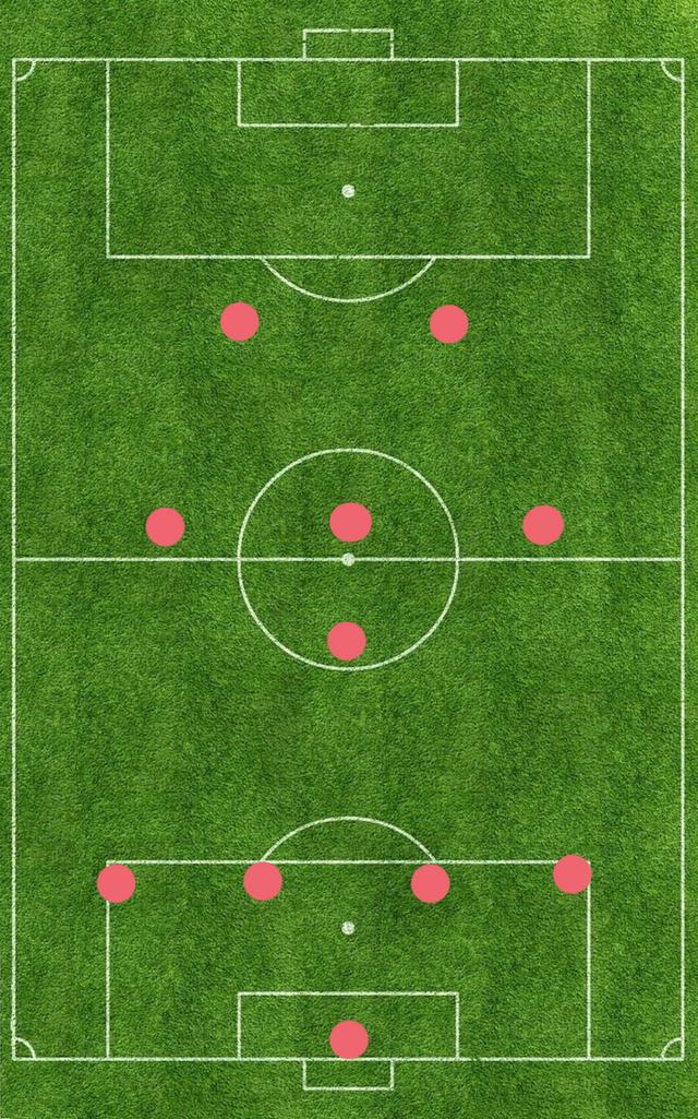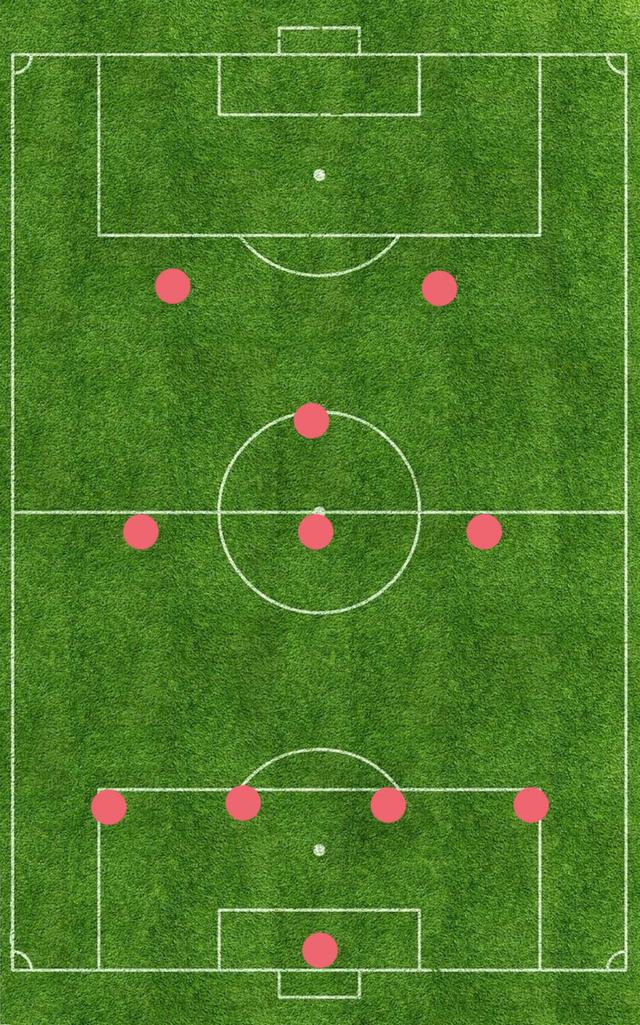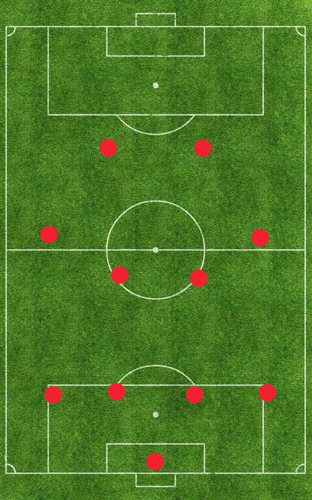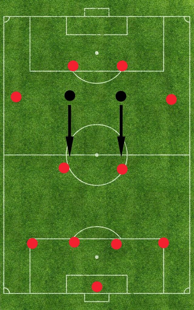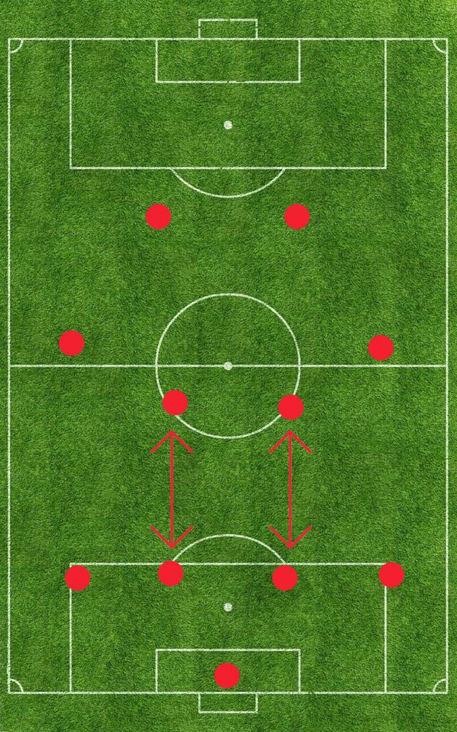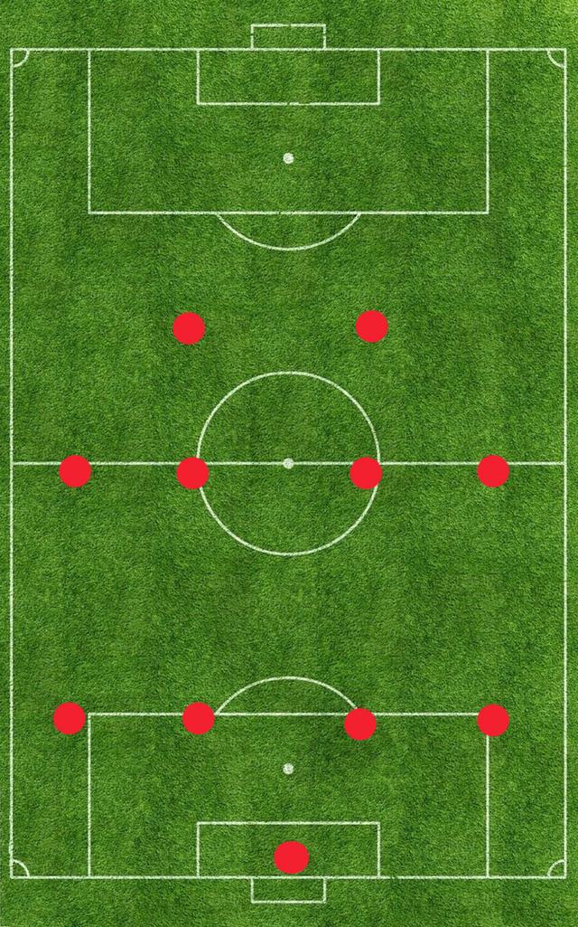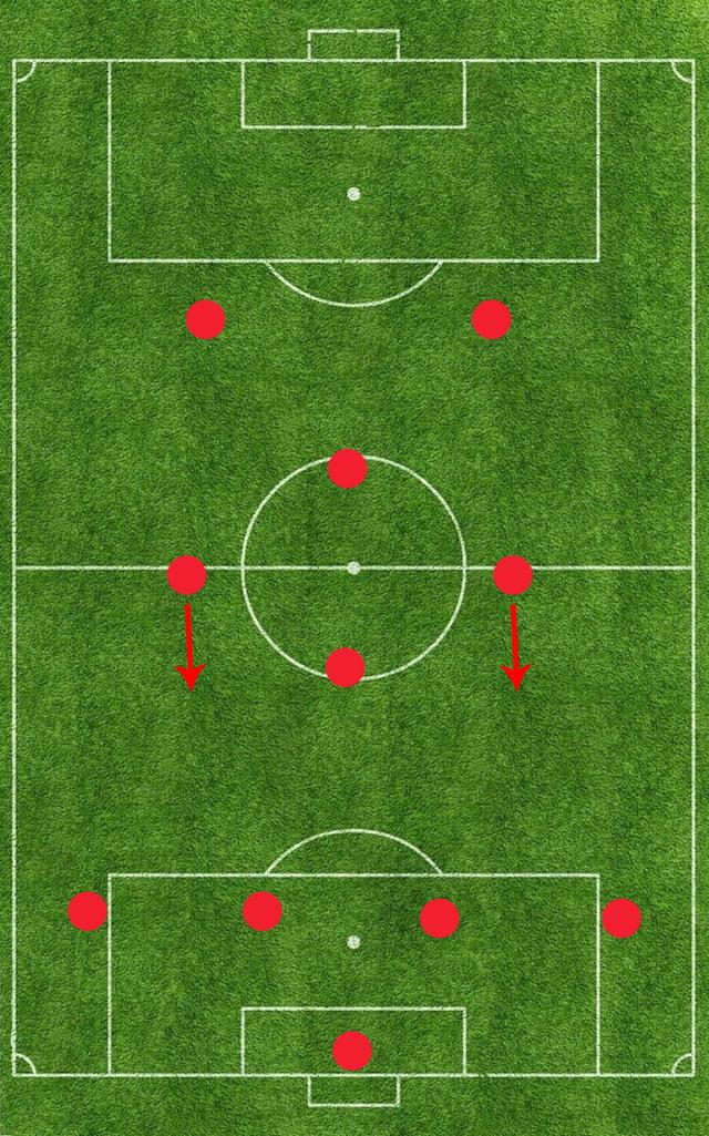 这种站位就如同名字一样,指的是保留两位边前卫,而两位居中的中场球员全部来自于后腰。这种转型对于防守的偏向性非常之大,一般来说使用这种中场站位的球队都来自于弱队,当然了,像曾经的英格兰以及意大利也普遍使用过这种阵容站位。