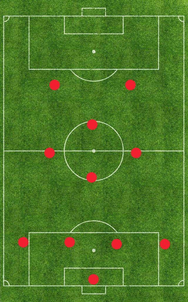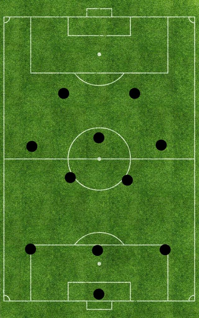 这种阵型大致的意思便如图所示:一位前腰球员突出,在他身后的是两位边前卫以及一位中前卫。这种阵型对于突前的那一位前腰球员的个人能力要求十分严格,因为这位前腰球员几乎承担了球队在中场的所有进攻组织重任,并且由于他是球队中场中唯一一个深入对方禁区弧顶的组织者,他所遭到对方的围抢强度也定然是十分强烈的。