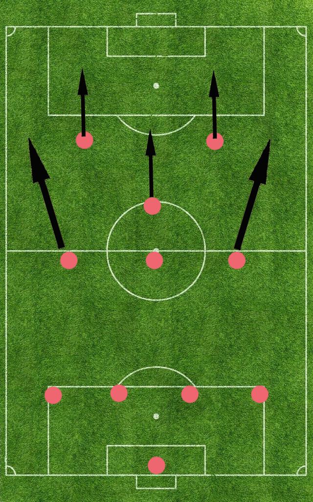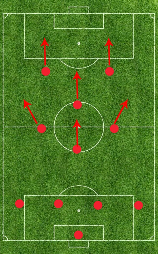 当然,在球队的进攻时那两位中场的边前卫也可以进行进一步的拉开,这样一来边路的突击能力便获得了极大的加强,这时候两位前锋球员插入进去进行抢点,而那位前腰则在禁区弧顶接应他们的倒三角或者回传。