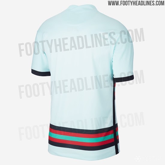 footyheadlines.com指出,此款球衣是以葡萄牙2016年欧洲杯的客场球衣作为设计灵感,整体依然采用了浅蓝绿色作为主色,不过球衣正面和反面大胆地使用了四组由黑色、红色、绿色组成的横条纹,视觉冲击力十分明显,此外球衣的袖口也采用了黑色作为点缀。