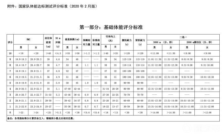 国家队体能达标测试评分标准(2020年2月版)