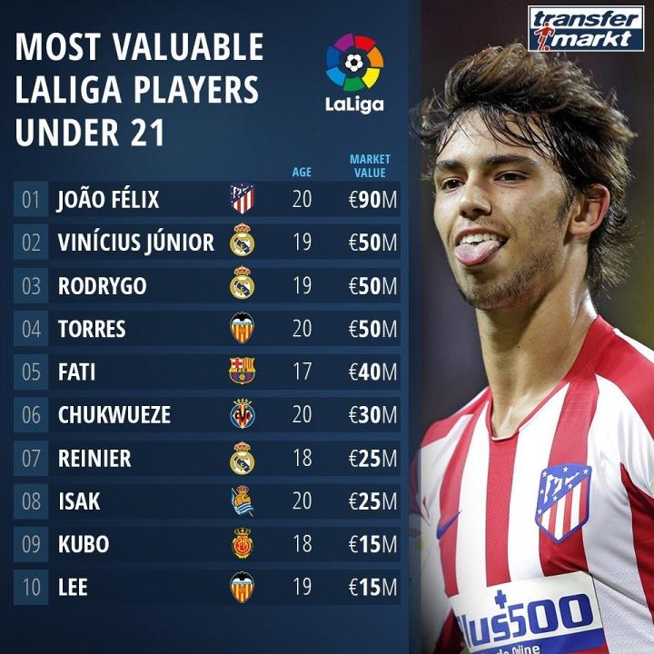 据德国转会市场网站发布,马竞前锋菲利克斯以9000万欧元的身价在西甲U21球员身价榜上排名第一。