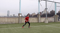 我们可以用墙或者和队友来回传球训练用脚外侧控球,一旦掌握我们就可以转脚45度在运动中接球,当防守队员冲过来的时候,用脚外侧在运动中触球更加隐蔽,更具欺骗性。
