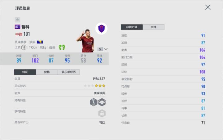 特别提到哲科,这是小编阵容中的主力中锋,小编与哲科的缘分起于一场排位,当时被对手那个立在禁区内哲科头球打到生活不能自理,本着打不过就加入的原则,买下了哲科。用过几场试验之后,好用程度超乎想象。双足5的属性,193CM的身高,禁区内无论头上还是脚下的终结能力都十分出色,反击中可以作为支点拿球再分球,对抗能力也十分出色,美中不足的是速度偏慢,银卡里85的平衡使他带球挤人的能力不足,89的速度和79的灵活严重限制了他的机动性,所以想要购入哲科的朋友们请谨慎