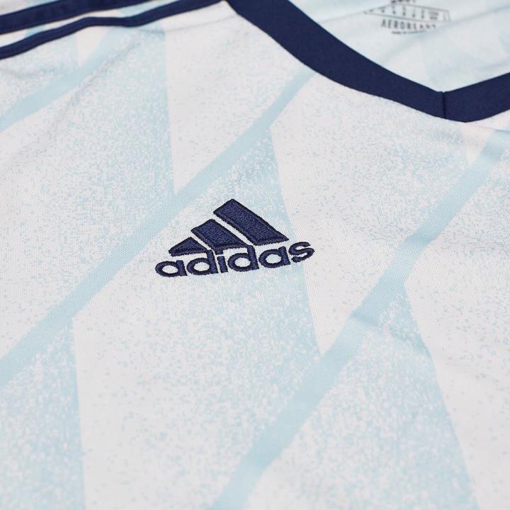 苏格兰国家队2020年全新客场球衣上拥有白色与浅蓝色组合而成的复古集合图案,让人不禁想到晴朗的天空。简约的V领与肩膀上的阿迪达斯胜利三条纹则采用色彩对比强烈的海军蓝色装饰。带有海军蓝色细节的白色球裤与球袜共同构成苏格兰代表队2020年完整的客场形象。