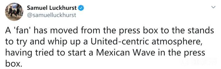 记者介绍说,这名“球迷”已经从媒体席孤身前往看台,想要给曼联制造出主场氛围。他之前在媒体席里还试图发动记者玩一波人浪。