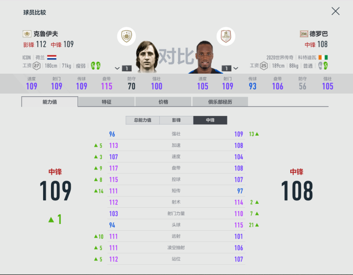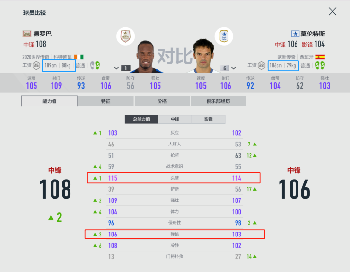 游戏中知名的头球大师,22工资的EL莫伦特斯6卡的头球数值是114,还是比起单卡德罗巴要逊色一些,并且莫伦特斯也没有德罗巴更能跳。