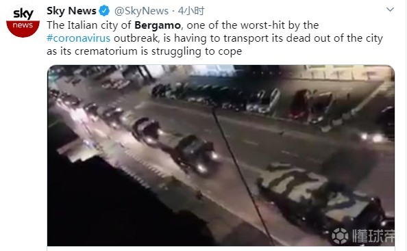 由于死亡人数过多,贝尔加莫的火葬场已经是不堪重负,当地政府紧急派出军队车辆来运送尸体,这样的场景让人感到恐惧。