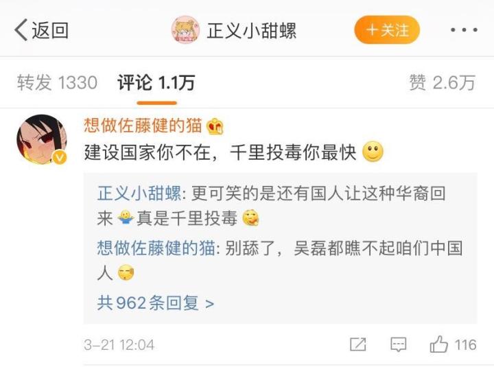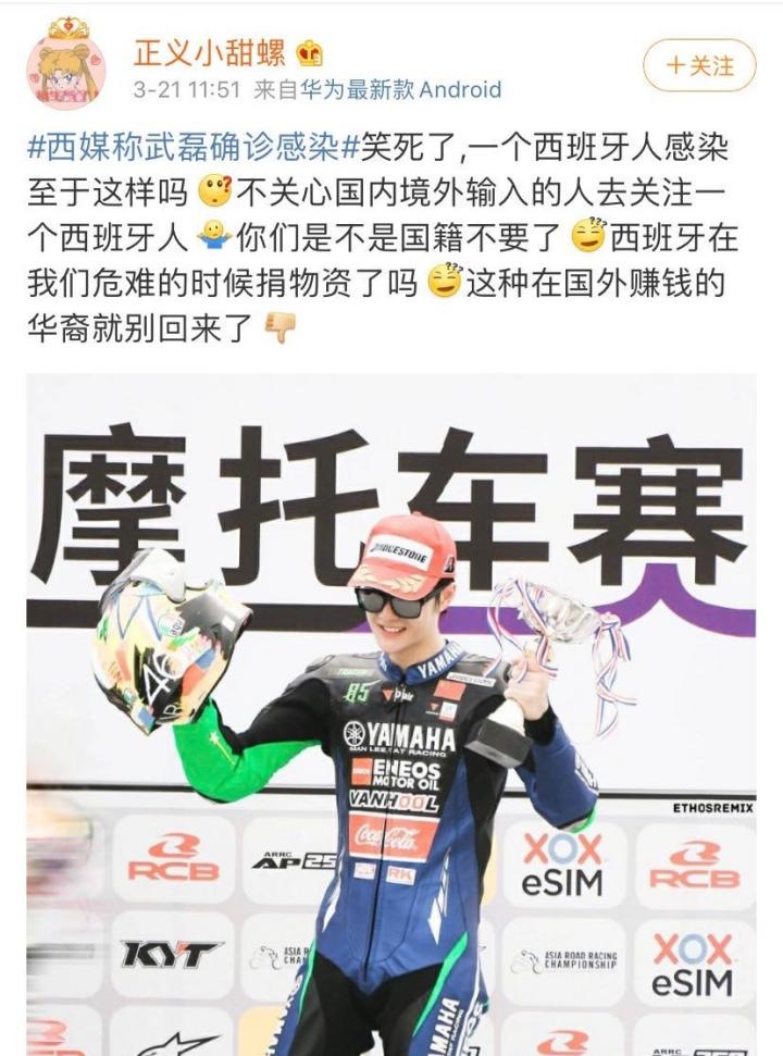 一名王一博的女粉丝(也有人说是肖战,但在这不做过多探寻)发博,主旨就是:武磊一个西班牙人,连国籍都换了,中国危难的时候你在哪?这种华裔就不要回国了。