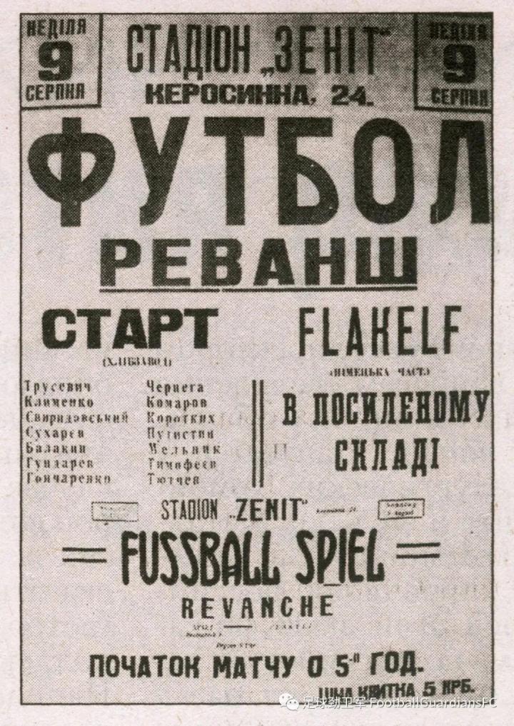 1942年8月,纳粹德国占领下的前苏联基辅泽尼特体育场,当地俱乐部Start(与迪纳摩很有渊源)和德国占领军进行了两个回合的比赛。第一回合Start5:1赢。第二回合比赛前,发了海报。(见下图)