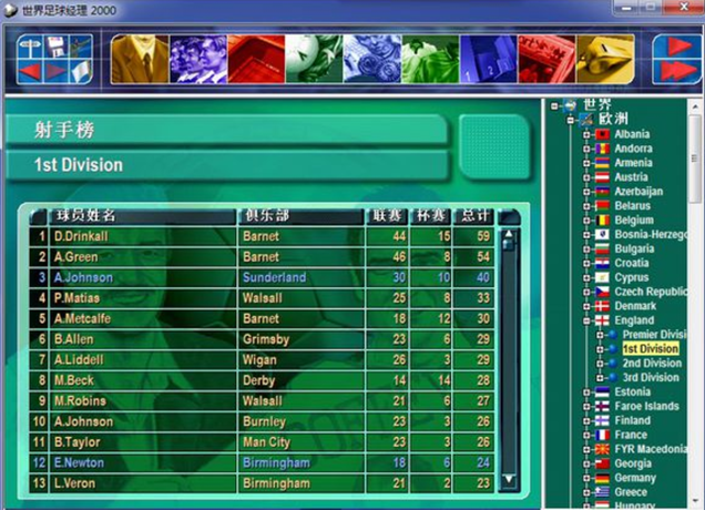这个游戏只能从英格兰、德国、法国、意大利、苏格兰这5个国家选择球队执教,游戏界面主色调是很经典的深蓝色,老玩家应该对这个界面都有印象。