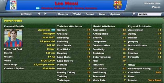 SI团队对于《FM2005》的打造精心且谨慎,首先是苦练内功,专业详实的扩展数据库,FM2005包括45个国家,140多个联赛,3000家俱乐部,25万名球员。全球各地聘用的数据观察员不计其数,为的就是做到每一名球员的数据真实准确。比如18岁的梅西,只不过是刚刚完成西甲处子秀的绿茵新人,但在FM2005中已经有了成为球王的潜质。