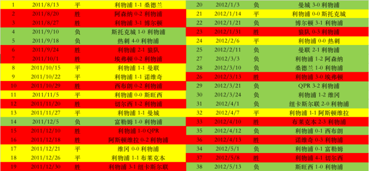 最后,附上利物浦11-12赛季的联赛战绩图,有什么想讨论的欢迎球迷在评论区留言