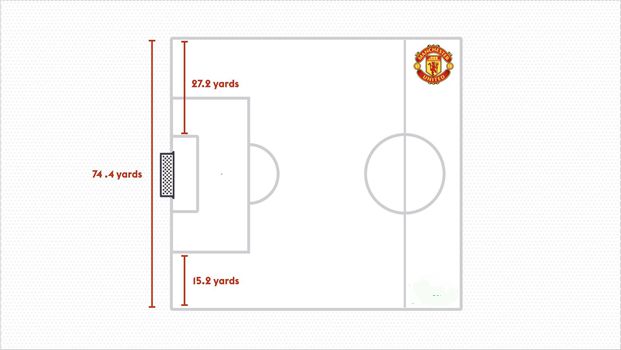 例如,曼联的老特拉福德的宽度是74.4码,从大禁区边缘到两侧边线的距离为15.2码, 这是球员在禁区附近接球的距离。