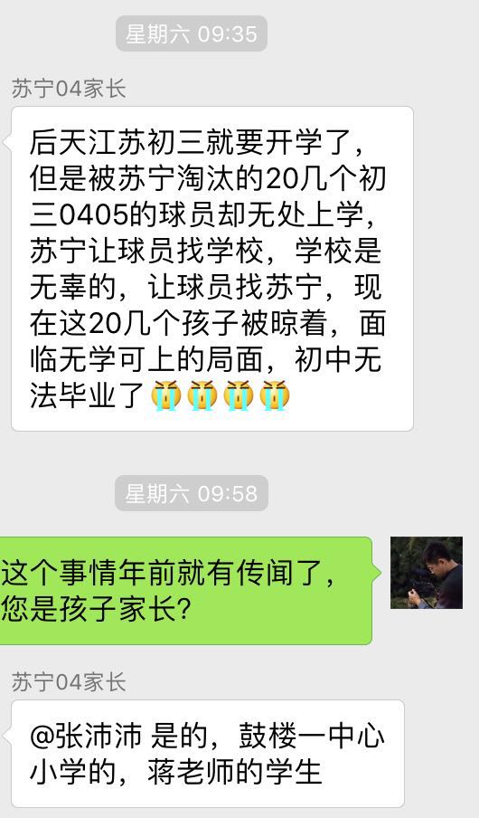 但是我还要举一个苏宁0405梯队的例子,苏宁0405这批孩子目前应该是初三下学期,夏天就应该中考完上高中了,苏宁之前0405是两支队伍A、B队,青超成绩都不错。但是苏宁在年前要裁掉一个队,也就是筛掉20多个孩子。一个队的孩子就没有地方去了,因为疫情影响目前来说还没有办法去别的梯队试训,但是又没有办法在本地上学。还有半年,学校说责任在苏宁,苏宁让家长找学校,互相推诿。