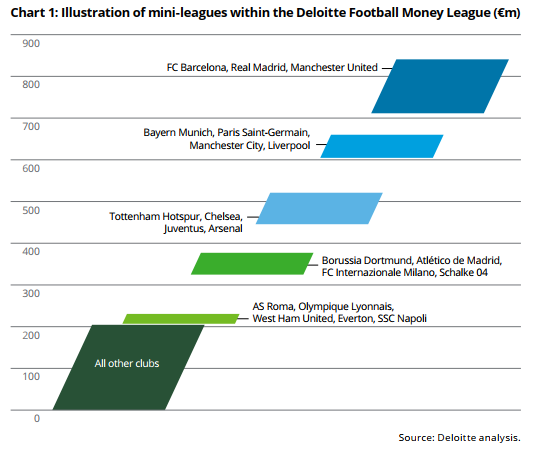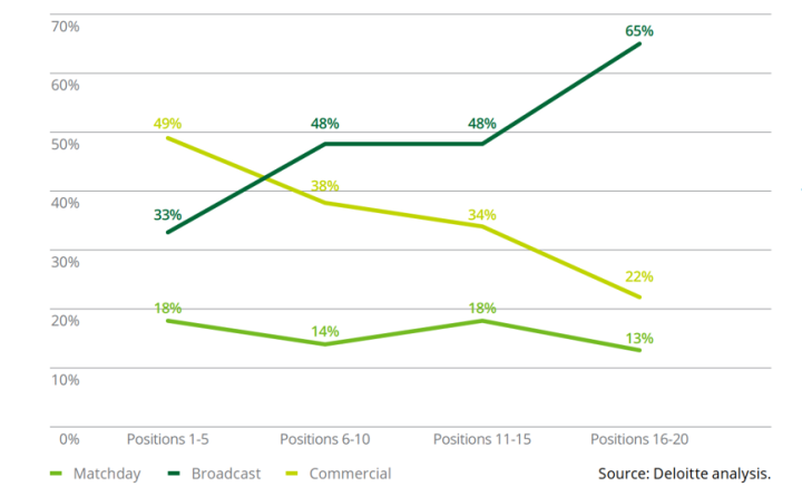 我们再来看一下欧洲豪门俱乐部的营收情况,在德勤发布的《2020德勤足球财富榜》中,排名第一的巴萨以破纪录的8.4亿欧元的营收排名第一,其中商业收入占比46%,转播权收入占比35%,比赛日收入占比16%。