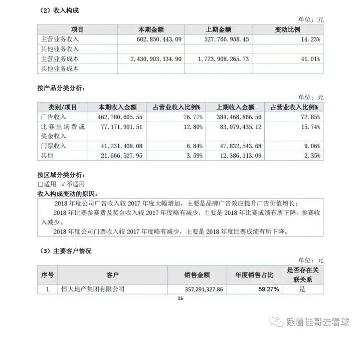 2. 收入方面:广告收入约为4.63亿元,占总收入的76.77%;比赛出场费和奖金收入约为0.77亿元,占总收入的12.8%;门票收入约为0.41亿元,占总收入的6.84%;其他收入约0.22亿(主要是商品销售收入),占总收入的3.59%;其中来自母公司恒大集团的收入就达到了3.58亿(母公司广告赞助变相输血),占总收入的59.27%;而来自中超公司的收入有0.73亿(中超奖金,转播权和赞助商分红),占总收入的12.11%;另有约0.3亿元的政府补贴收入