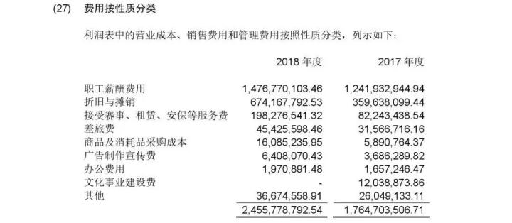 3.成本方面:员工薪酬支出达到约14.7亿,占到了总成本的60%;折旧与摊销约6.7亿(球员转会费按合同年限摊销),占总成本的27%(总人力成本占总成本的87%);场地租赁和安保费约2亿,占总成本的8%;另有差旅成本约4500万,商品成本约1600万