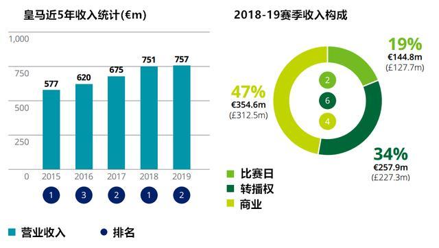 排名第二的皇马总收入7.57亿欧元,其中商业收入占比47%,转播权收入占比34%,比赛日收入占比14%。