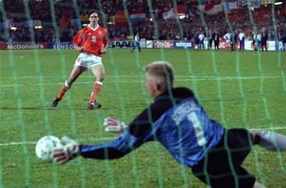 另一场半决赛由夺冠热门荷兰迎战丹麦。拉尔森头球首开纪录,博格坎普外围抽射扳平比分。随后拉尔森打入一球,而里杰卡尔德在第88分钟为荷兰队再度扳平。比赛就这样进入了加时赛。加时赛中双方均无建树,比赛进入点球大战。舒梅切尔扑出了范巴斯滕的点球,将丹麦送入了决赛。