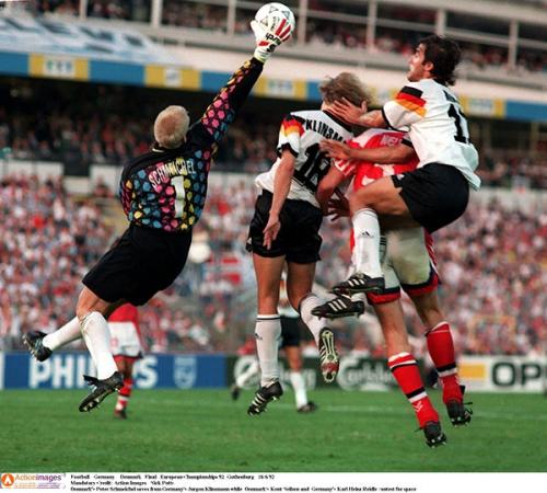 1992年6月26日的哥德堡,面对强大的德国队,丹麦童话并没有消散,歌谣还在继续,丹麦队的神奇也在继续,舒梅切尔在这场比赛里高接抵挡,多次封堵了德国队的进攻,而随着延森和维尔福特的进球到来,丹麦取得了最后的胜利。