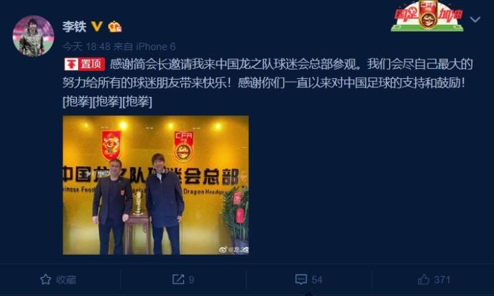 李铁此后也更新了个人微博,他写道:“感谢简会长邀请我来中国龙之队球迷会总部参观。我们会尽自己最大的努力,给所有的球迷朋友带来快乐!感谢你们一直以来对中国足球的支持和鼓励!”