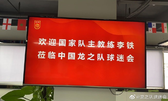 李铁的到来也受到了球迷会的热烈欢迎,在屏幕上显示有“欢迎国家队主教练李铁莅临中国龙之队球迷会”的内容。中国龙之队球迷会官方微博则发文写道:“龙之队未来将一如既往作为‘第12人’和中国国家队共同战斗,我们也会继续团结全国球迷,为传播中国球迷文化、弘扬中国球迷正能量以及中国足球的发展战斗到底!疫情结束后,希望全国球迷能和龙之队一起,成为国足冲击2022年卡塔尔世界杯的最坚实后盾!让我们一起为国足加油,加入龙之队,加入战斗!”