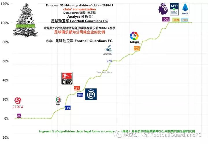 以欧洲55个会员国家或地区的顶级联赛俱乐部为例,我们根据欧足联2018-19赛季的官方数据,就公司化的比例,分析得出下表: