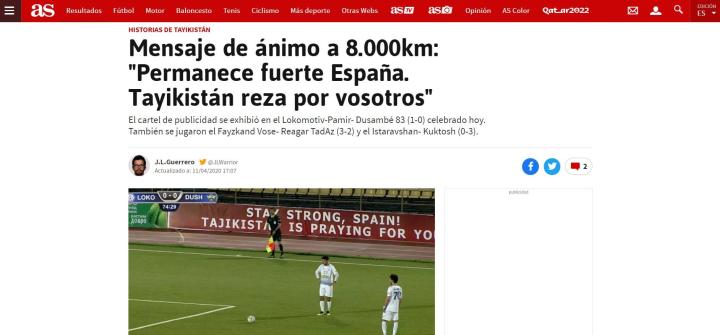 据悉,在疫情期间比赛稀缺的情况下,有西班牙媒体选择对塔吉克斯坦联赛进行转播;塔吉克联赛方面则通过场边广告的形式,来为受到疫情严重影响的西班牙加油打气。知名西媒《阿斯报》也报道了此事,并为该项赛事编写了简介及战报。