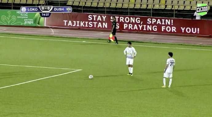塔吉克斯坦联赛是疫情期间全世界少数仍在进行的赛事之一,而本轮比赛的场边广告上则打出了为西班牙加油的口号。