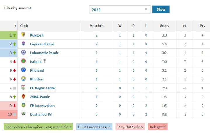 第2轮塔吉克斯坦联赛已结束三场比赛,另外两场的结果分别是费茨坎德主场3-2击败雷加塔达兹,伊斯塔拉夫尚主场0-3不敌库克涛斯。积分榜上,前三名都在多赛一轮的情况下1胜1平同积4分,库克涛斯以净胜球优势暂居榜首,费茨坎德、帕米尔火车头分列二、三位。