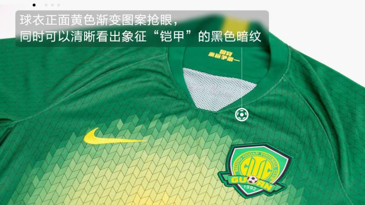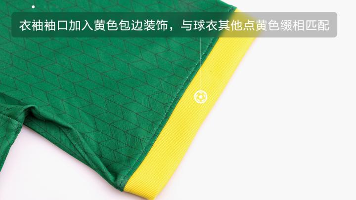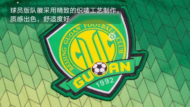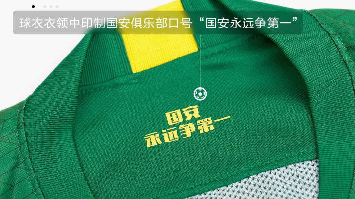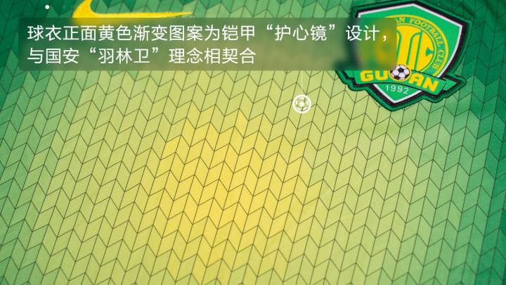 2020赛季北京国安主场球衣采用了传统绿色作为主色调,球衣衣体加入象征铠甲的黑色纹理,而胸口醒目的黄色渐变效果,实为铠甲“护心镜”设计,这也与球队“羽林卫”的理念相符合。当然,很多球迷吐槽国安“争”来的独特设计有些难看,但是球衣设计原本就是见仁见智,喜欢的人肯定觉得特别好看。