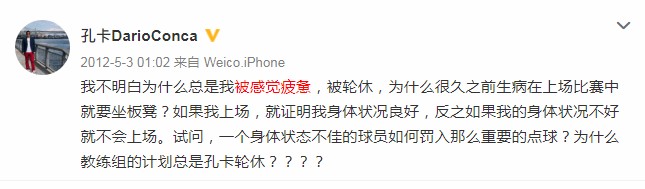 在微博这一战场,孔卡将自己的不满与不解倾泻而出:“我不明白为什么总是我被感觉疲惫,被轮休,为什么很久之前生病在上场比赛中就要坐板凳?如果我上场,就证明我身体状况良好,反之如果我的身体状况不好就不会上场。试问,一个身体状态不佳的球员如何罚入那么重要的点球?为什么教练组的计划总是孔卡轮休???? ”
