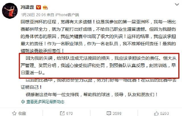 亚洲杯真可谓是冯潇霆生命中的“不可承受之重”,因为在国足同伊朗的比赛中出现重大失误,进而导致自己在俱乐部被下放到了预备队。冯潇霆本人并未回避俱乐部的处罚,他在接到处罚通知后表示:“因为我的失误,给球队造成无法挽回的损失,我应该承担该负的责任。恒大从严管理、奖罚分明,我诚心接受批评和处罚,到预备队认真反思,刻苦训练,早日重返一队。”