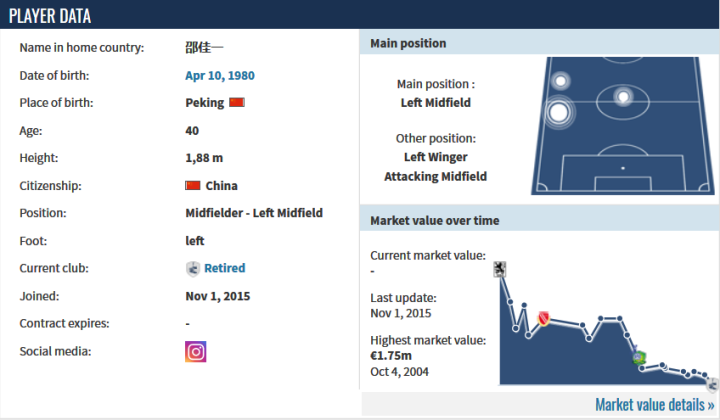邵佳一(1980.4.10)39岁,身高188cm,体重78kg,司职中场,曾效力于德国慕尼黑1860、科特布斯、杜伊斯堡,职业生涯最高身价175万欧元,出生于北京市。
