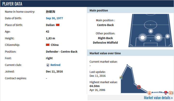 孙继海(1977.9.30)42岁,身高183cm,体重75kg,司职后卫,曾效力于英格兰水晶宫、曼城、谢菲联,职业生涯最高身价450万欧元,出生于辽宁省大连市。