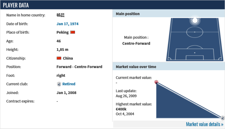 杨晨(1974.1.17)46岁,身高185cm,体重79kg,司职前锋,曾效力于德国法兰克福、圣保利,职业生涯最高身价40万欧元,出生于北京市。