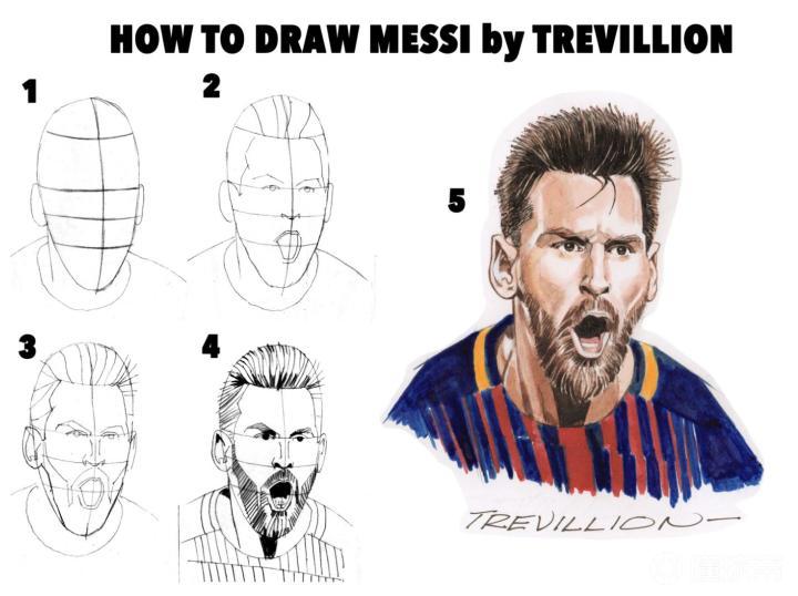 根据保罗-特雷维里翁的讲述,画梅西的肖像需要5个步骤。先用线条确定比例、头部的形状和位置。从头顶往下画一条稍微偏左的线,因为那是梅西看向的地方。用简单的线条添加梅西的五官,然后逐渐丰富细节。